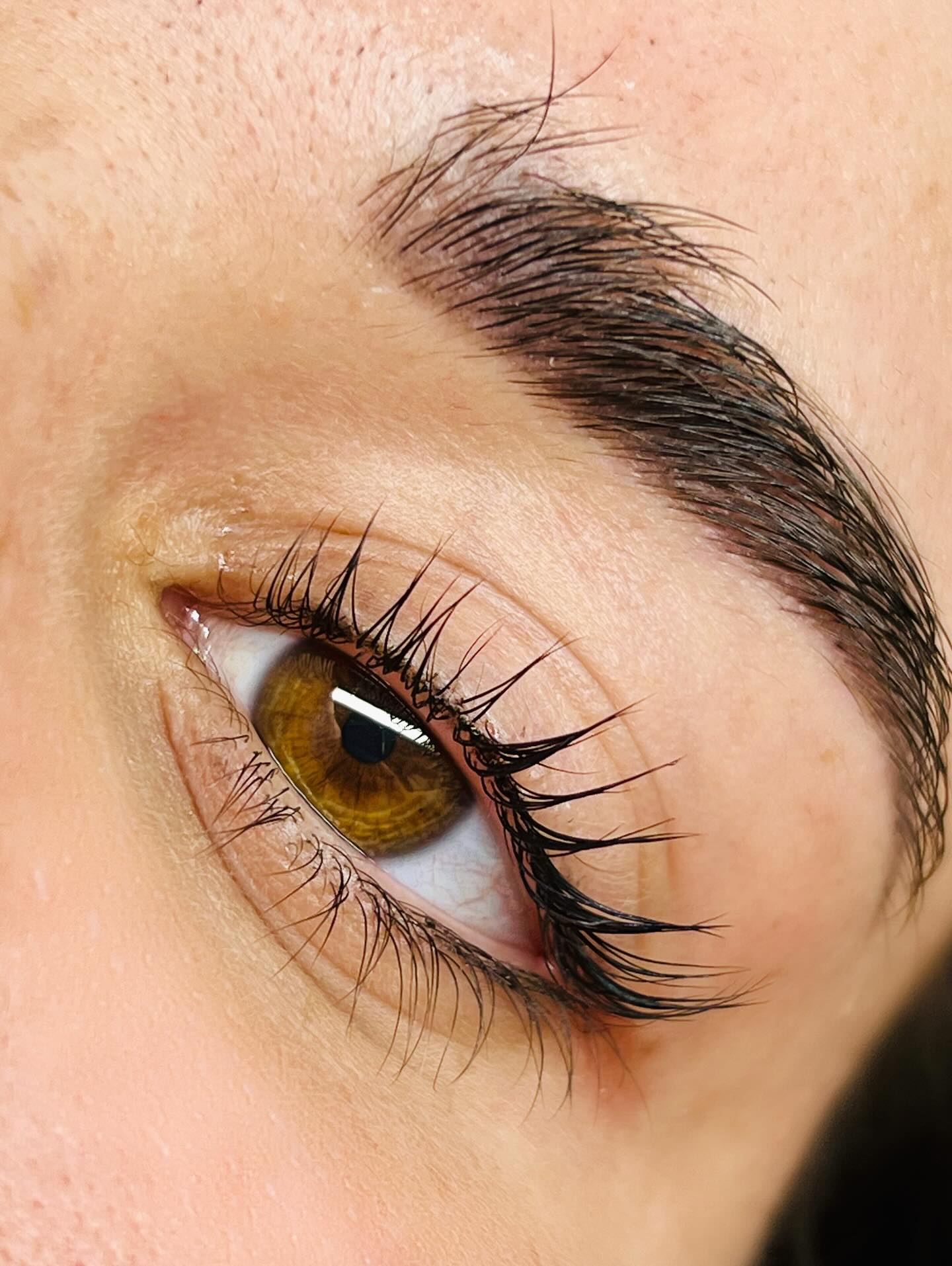 Természetes szempillái felfelé hajlítva és ápolva. A szemöldök lamináció rendezett, telt hatást biztosít.